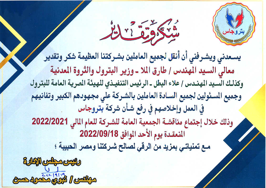 المهندس نبوى محمود حسن ينقل للعاملين شكر السيد المهندس / طارق الملا معالى وزير البترول والثروة المعدنية